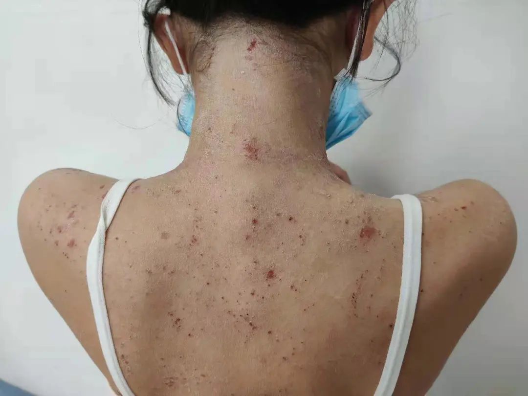 皮炎出现在面颈、肘窝、腘窝和小腿部位,以慢性为主,也可能会出现全身的发痒性丘疹。