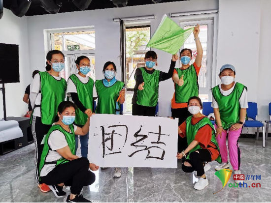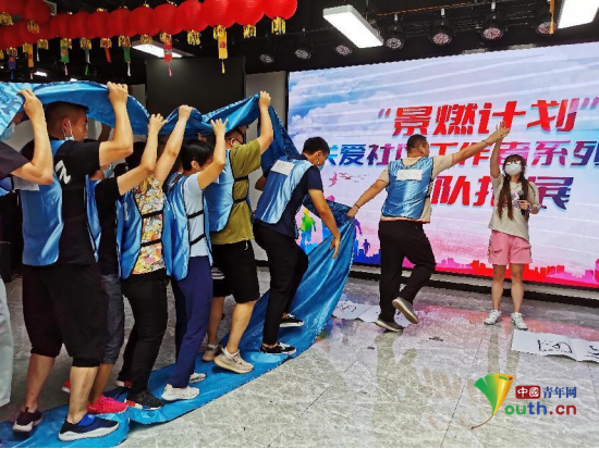 中国青年网北京7月29日电(记者 乔佳新)近日,北京市石景山区苹果园街道的四十余名社区工作者们迎来了“景燃计划”系列活动(下称“景然计划”)在该社区的首场团队拓展活动。活动中社区工作者们积极活跃的身影与此起彼伏的欢笑声交融,现场氛围十分热烈。社区工作者现场完成分组,在“神笔马良”“一圈到底”“无敌风火轮”“同心鼓颠球”等多个趣味游戏中锻炼了团队协作能力,鲜活有趣的队名、队旗、口号体现出各自团队的精神风貌。
