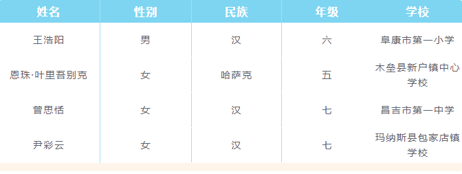昌吉州入选第十五届宋庆龄奖学金候选人的4名学生分别是: