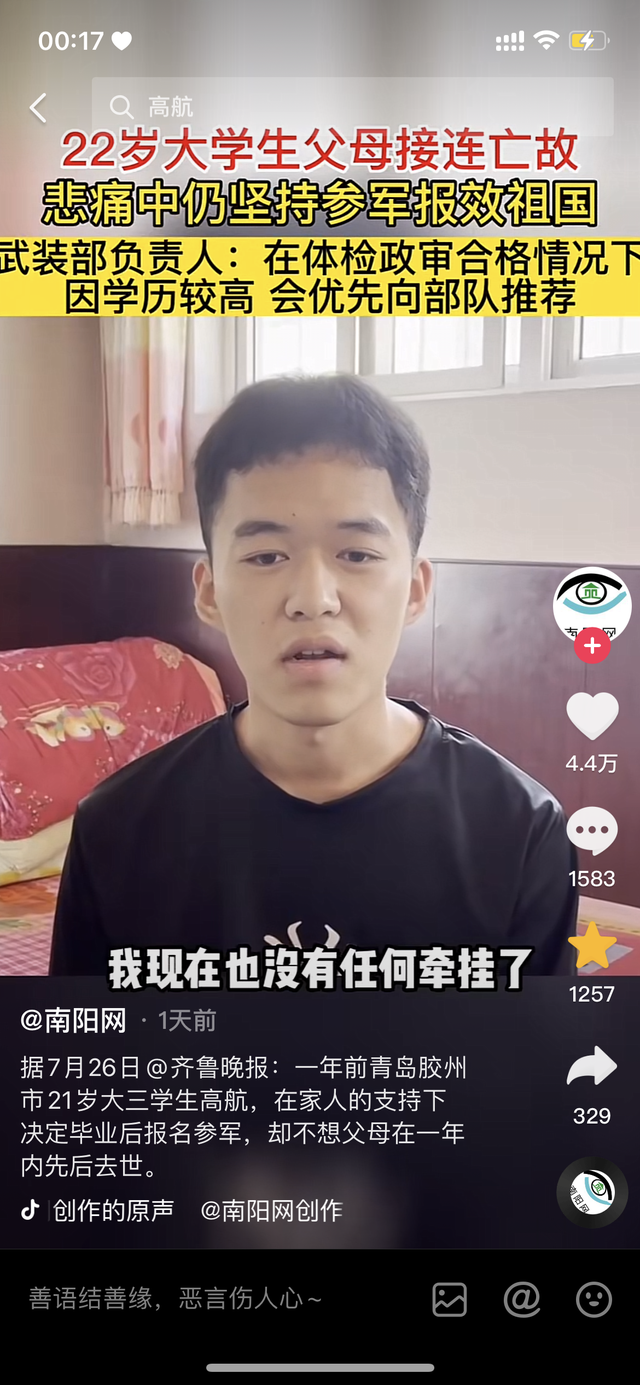 对于高航的遭遇和去参军的决定,网友们纷纷表示钦佩,并为高航日后的人生道路加油鼓劲: