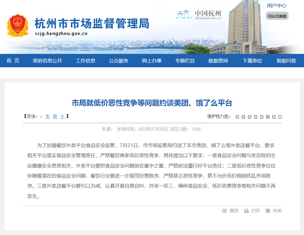 为了加强餐饮外卖平台食品安全监管,7月21日,浙江省杭州市市场监管局约谈了该市美团、饿了么等外卖送餐平台,要求相关平台落实食品安全管理责任、严禁餐饮商家低价恶性竞争,具体提出以下要求: