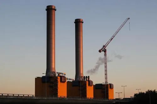 △2021年10月德国柏林一座正在拆除烟囱的热电厂。