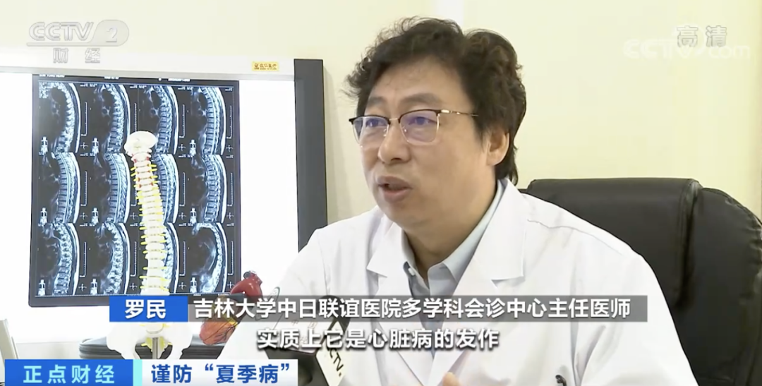 吉林大学中日联谊医院多学科会诊中心主任医师 罗民:冷热变化对神经刺激,引起心脏血管剧烈收缩,出现了胸闷、气短、难受,不了解的以为是中暑,实质上它是心脏病的发作。这个病有年轻化趋势,因为交感神经对温度的变化非常敏感,年轻人伏案工作过多,神经系统已经受损,如果再冷热一刺激,很容易犯病。