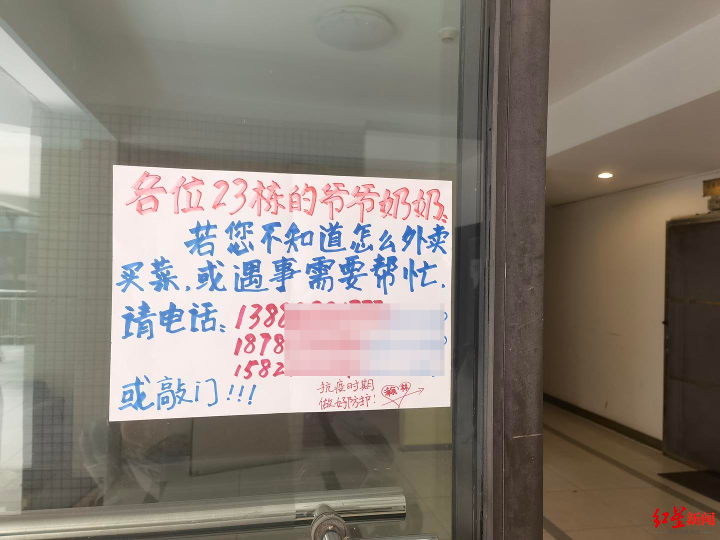 在瀚林花园小区23栋2单元的大门上,两张纸条悄悄贴出:“各位23栋的爷爷奶奶,若您不知道怎么外卖买菜,或遇事需要帮忙,请电话或敲门。”纸条上,留下了3个联系方式和门牌号,以及温馨提示“疫情期间做好防护”。