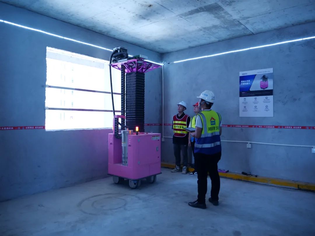 “测量机器人对整个施工场所进行测量并建立模型,然后联动对接到打磨机器人进行直接施工。”碧桂园黄金时代项目负责人甘昊介绍,自动测量机器人设备一扫,2分钟即可完成单个房间实测。9大类指标数据、分析报告和房间三维图像同步呈现。同时联动的建筑机器人,能自动规划线路,立即进行施工作业。