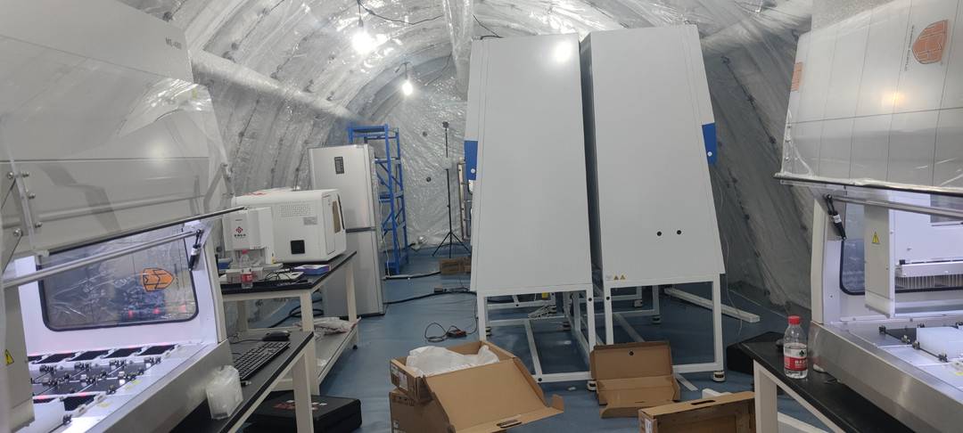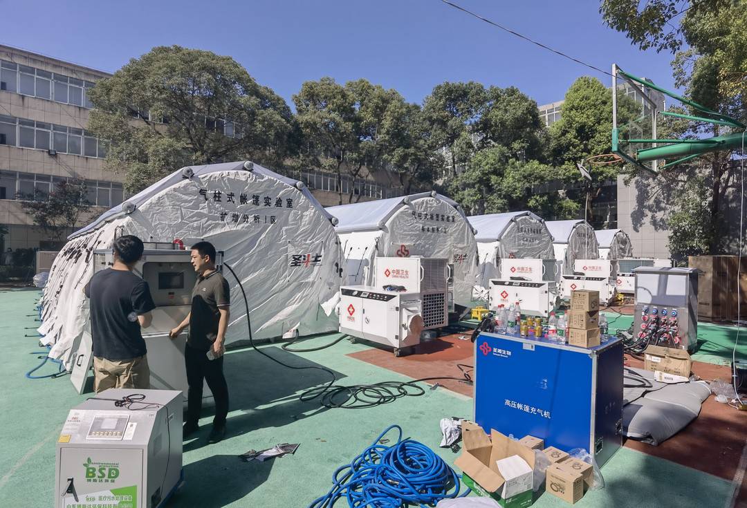 据介绍,实验室位于成都市高新区中和街道应龙社区四川省人民医院中和科研基地(原四川省人民医院护士学校操场)。7月27日晚上11点,所有设备就位开始搭建,28日凌晨4点,六台气膜完成搭建,历时5个小时;9点,所有设备完成安装,28日16:00所有设备调试完毕,完成现场清理,严阵以待。该实验室日检测能力可达5万管。
