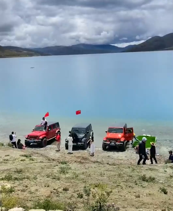 7月27日晚,有网友上传视频反映,西藏山南市羊卓雍措景区内,有一群自驾游游客将车开进当地的圣湖——羊湖(羊卓雍措)中。据视频显示,有三台车停在湖边浅水处,其中有游客坐在车顶上正在拍照。