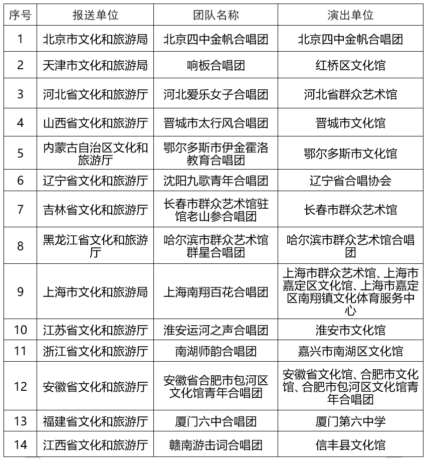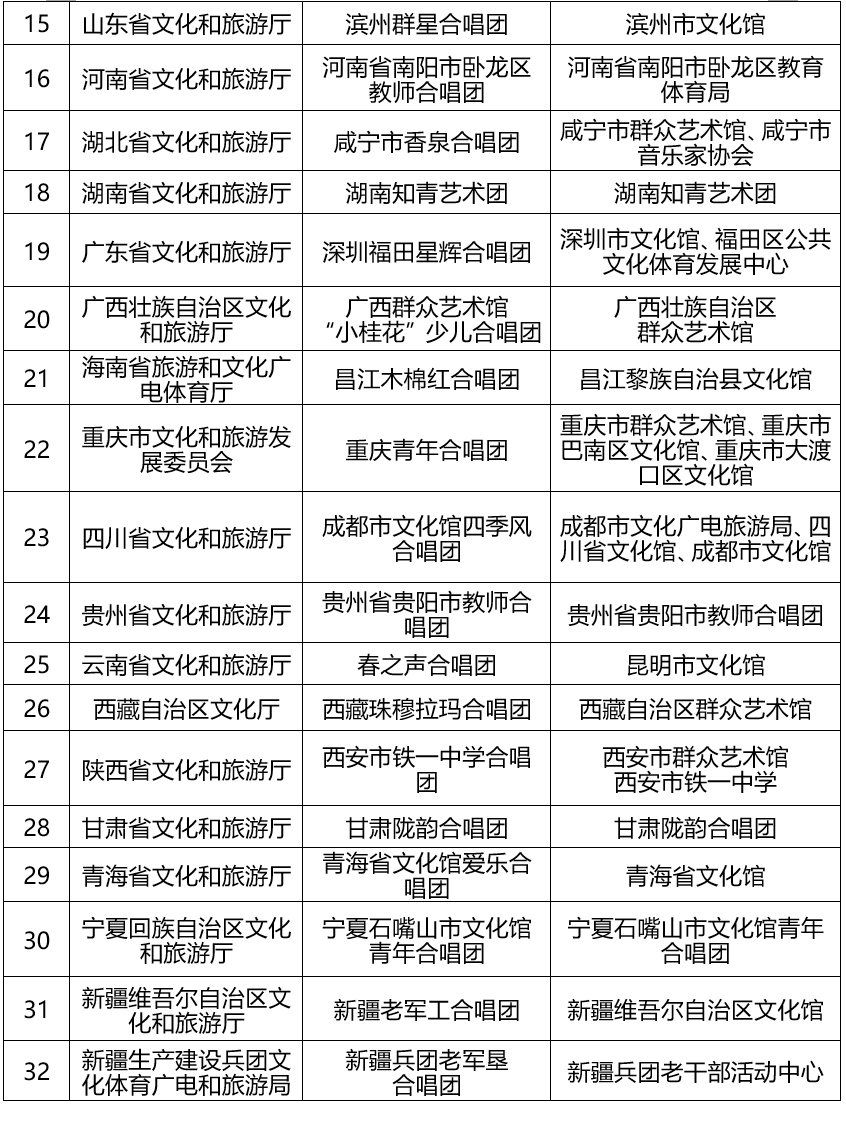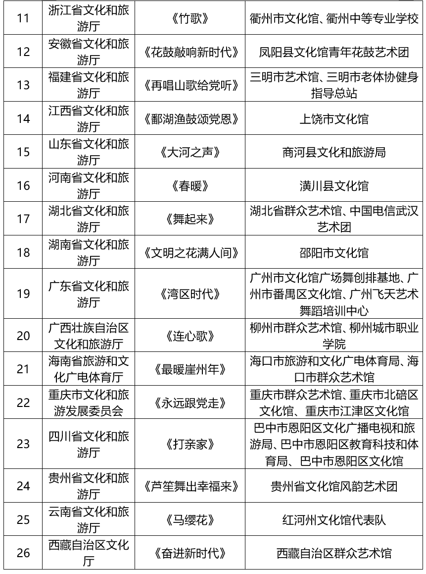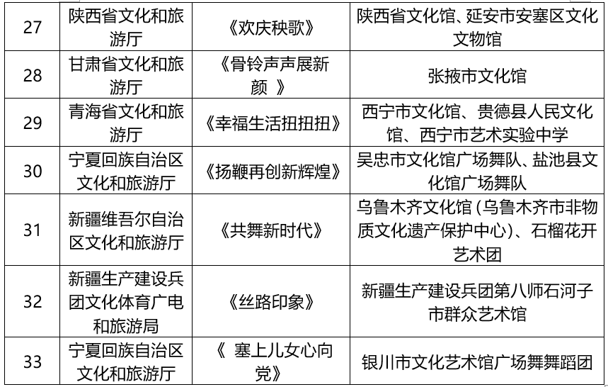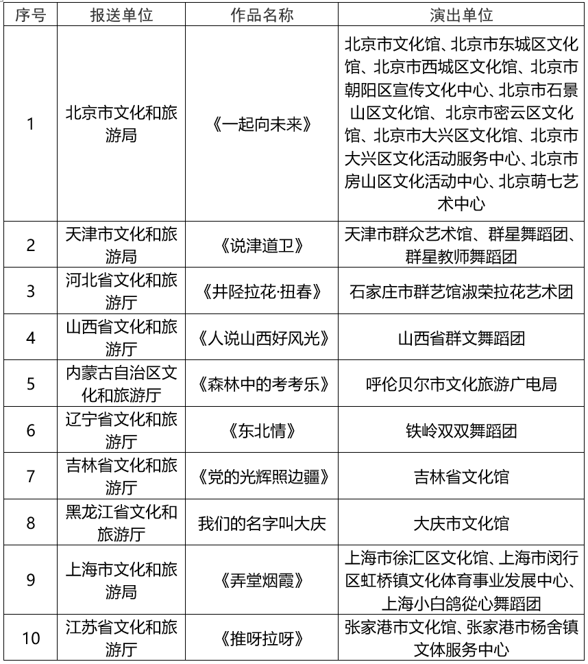 根据《文化和旅游部办公厅关于开展第十九届群星奖广场舞、群众合唱评奖工作的通知》(办公共发〔2022〕111号),文化和旅游部组织各报送单位开展第十九届群星奖广场舞、群众歌唱初选和报送,形成了第十九届群星奖广场舞决赛入围作品名单和群众合唱决赛入围团队名单。