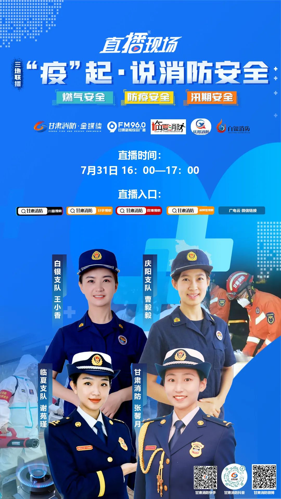 7月以来,我省部分地区出现新一轮新冠肺炎疫情,很多朋友再次进入居家办公的模式,加之近期,火灾、燃气等事故多发,为我们敲响了警钟。那么,生活中如何安全使用酒精、燃气,如何安全度过汛期等,周日下午16点,走进“甘肃消防”直播间,甘肃总队与白银、庆阳、临夏支队直播联动,分别为大家带来家用燃气、居家防疫、雨季汛期等消防安全常识,参与公屏互动,还有消防定制奖品等你哦~
