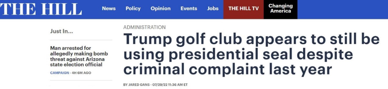 《国会山报》称,该组织在起诉书中表示,这起事件表明特朗普的高尔夫俱乐部知道或应该知道使用总统徽章是非法的,但无论如何仍在使用。