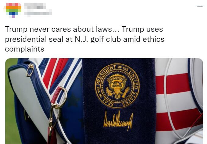 【环球网报道 记者 李珊】据美国《国会山报》29日报道,尽管面临刑事诉讼,美国前总统特朗普位于新泽西州贝德明斯特的高尔夫俱乐部近日被发现仍在使用总统徽章。