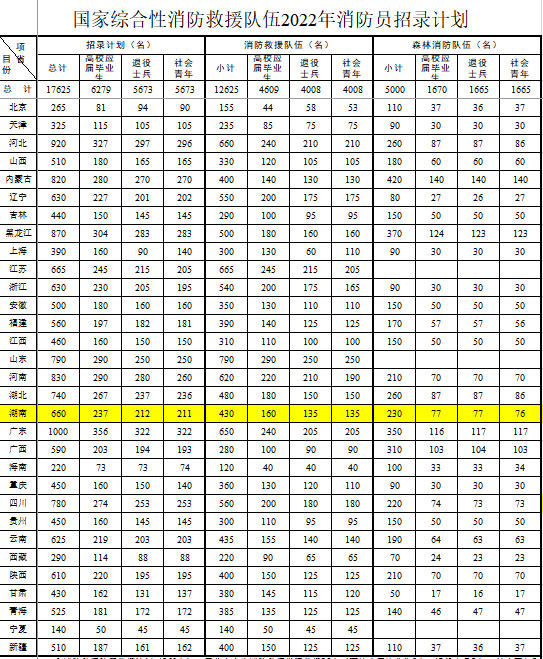 长沙晚报掌上长沙7月30日讯(全媒体记者 刘琦)日前,应急管理部发布《应急管理部关于国家综合性消防救援队伍2022年面向社会招录消防员的公告》。记者了解到,此次国家综合性消防救援队伍共招录消防员17625名(均为男性),含高校应届毕业生6279名、退役士兵5673名、社会青年5673名。其中,湖南省招录计划为660名(消防救援队伍430名,森林消防队伍230名),含高校毕业生237名、退役士兵212名、社会青年211名。