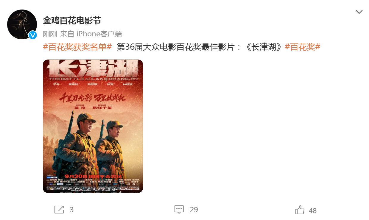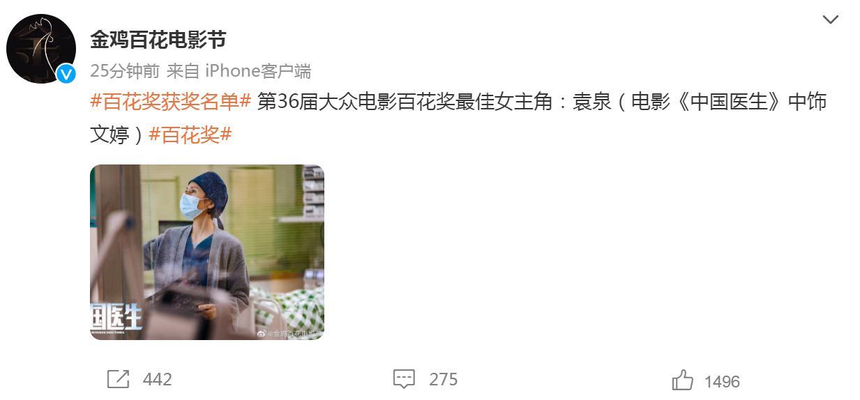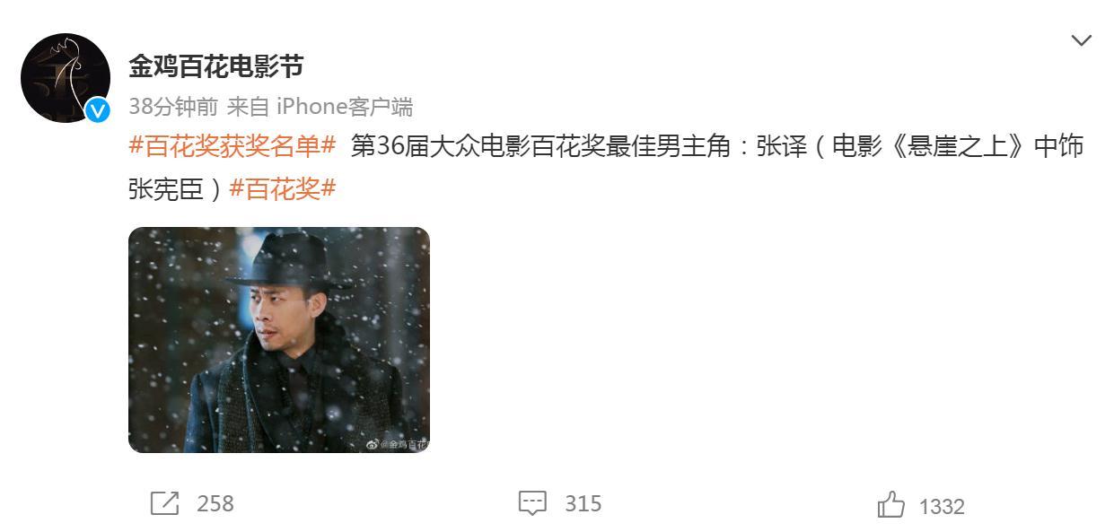 据金鸡百花电影节微博消息:张译凭借《悬崖之上》中张宪臣一角获得最佳男主角奖,袁泉凭借《中国医生》中文婷一角获得最佳女主角奖。《长津湖》获最佳影片奖,《你好,李焕英》获优秀影片奖。