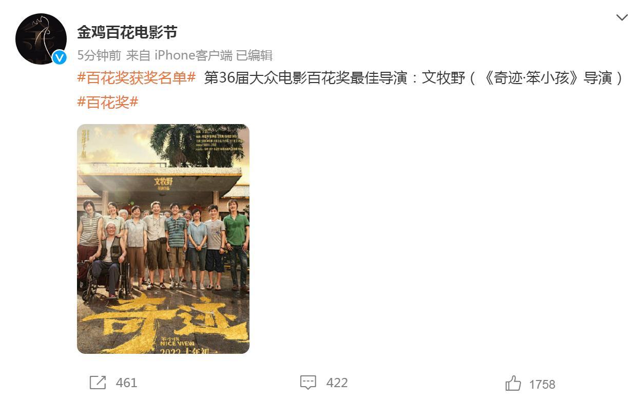 最佳导演:文牧野(《奇迹·笨小孩》)