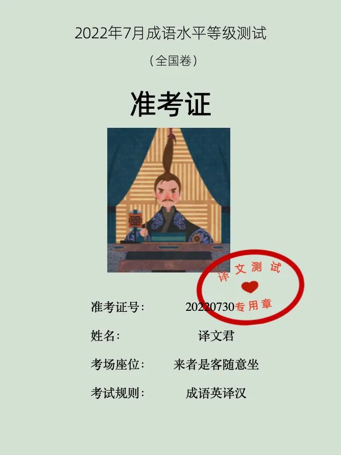 如何用英语表现我们“高山流水”的情谊?在看答案前请收下这张准考证,先测试下自己的成语等级吧!