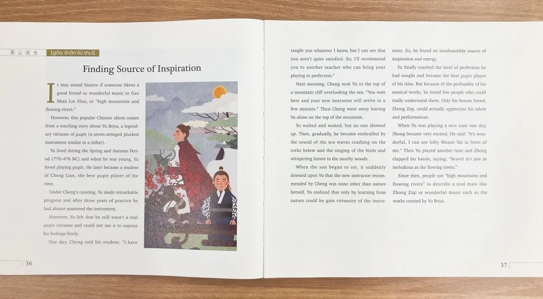 单从翻译角度,可以将成语写为“high mountains and flowing rivers”,然而这并不能完全说明成语的来源和意义。在“中华优秀传统文化传承系列”《中国成语故事》(英文版)中,张慈贇先生将这个成语故事命名为“Finding Source of Inspiration”,为我们用流畅的英文讲述了该成语的故事渊源以及涉及到的历史人物俞伯牙和钟子期之间知音难求的动人故事——
