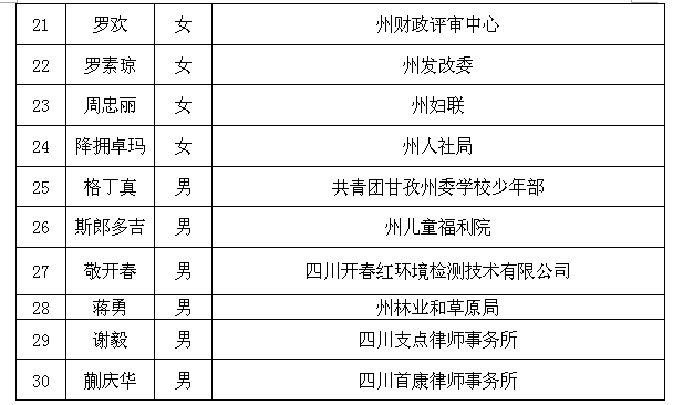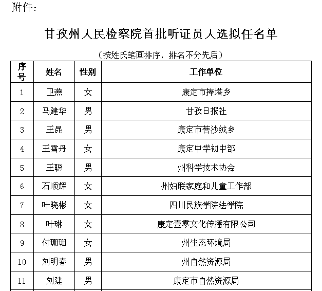 公示根据最高人民检察院印发的《人民检察院听证员库建设管理指导意见》,甘孜州人民检察院依照选任条件和程序,拟任卫燕等30名同志为甘孜州人民检察院首批听证员,现向社会公示。公示期为5个工作日。公示期间,如对拟任人选有异议,可通过来电、来信等方式向甘孜州人民检察院案件管理办公室反映。以单位名义反映问题的应加盖公章,以个人名义反映的应署本人真实姓名和联系方式。联系电话:0836-2823102邮寄地址:甘孜州人民检察院案件管理中心附件:甘孜州人民检察院首批听证员拟任名单甘孜州人民检察院2022年7月28日