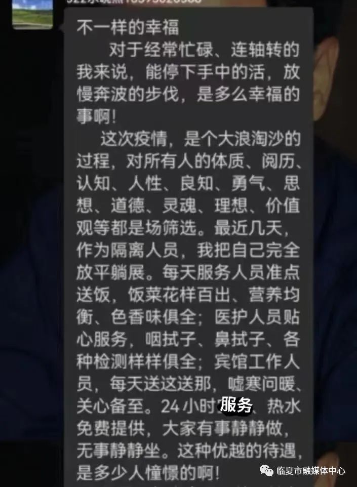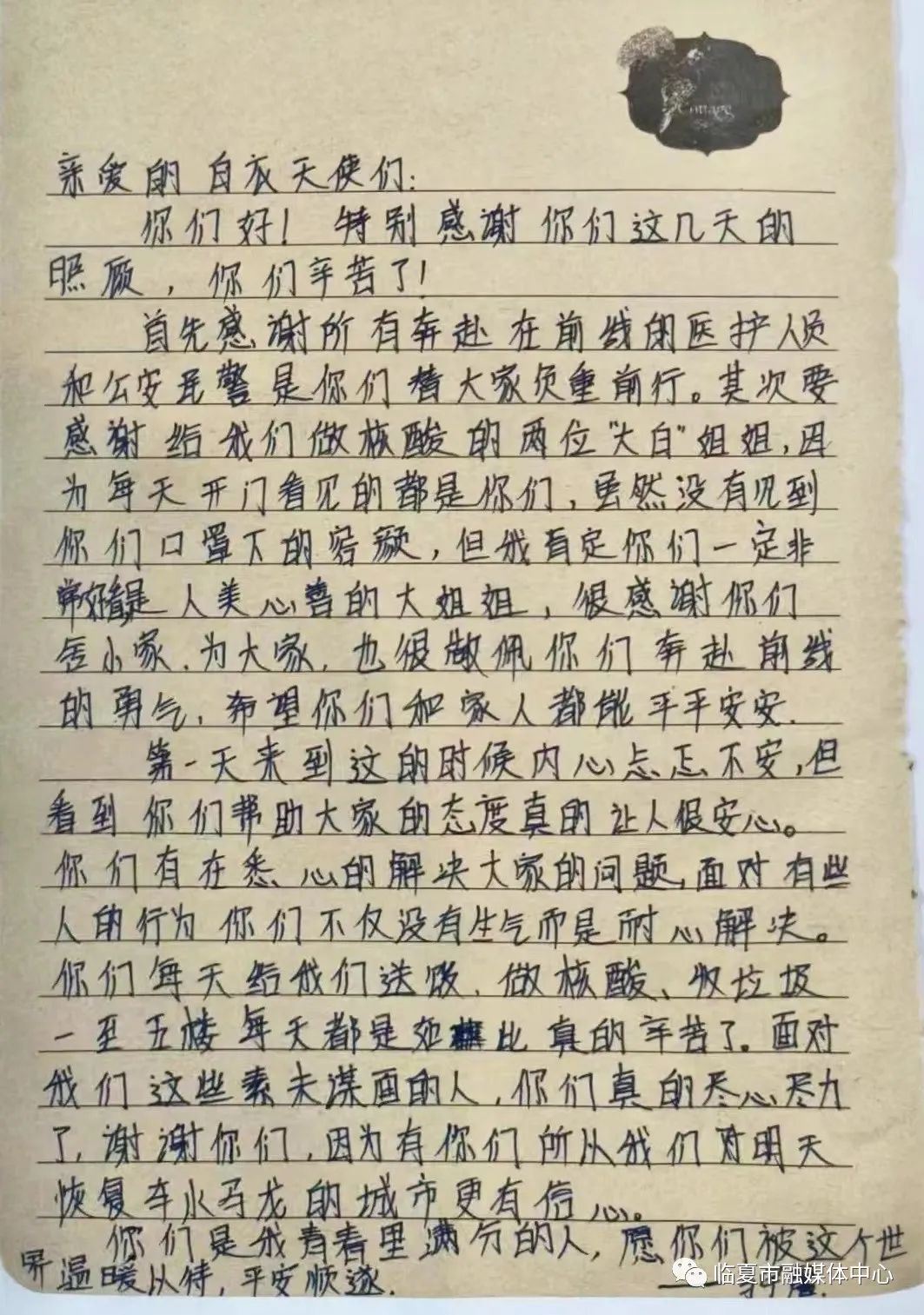不止这些,同样接受隔离的水女士也在她的感谢信里写下:“你们不是亲人,却胜似亲人。危难时刻,冲在前线的你们舍小家为大家,肝胆相照,休戚与共,留守后方我们应该恬以养志,静候佳音!”这才是临夏人在疫情防控之下应该有的素养和自律!