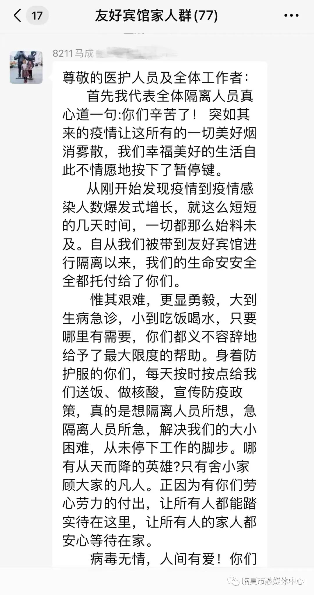 “大到生病急诊,小到吃饭喝水,只要哪里有需要,你们都义不容辞的给予了最大的帮助……”这也是来自由临夏市民族医院负责的友好宾馆隔离点的马先生在友好宾馆家人群里发出的一段文字,感谢信弹出后,大家纷纷附言感谢,并配上点赞表情。