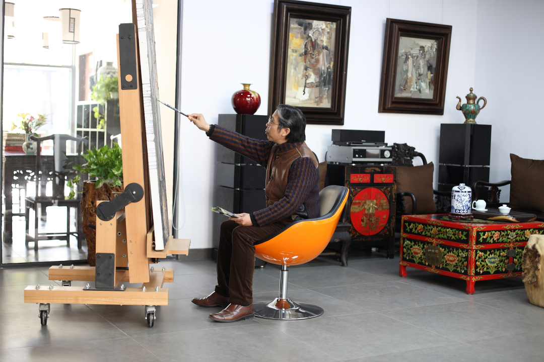 彭小杭喜欢坐在工作室里,看自己的作品,看这些画的色彩、构图、造型、笔触,一坐就是几小时。他有个“毛病”,画得不满意,就刮掉重来。有时候一个地方画得不好,常常重复两三次。