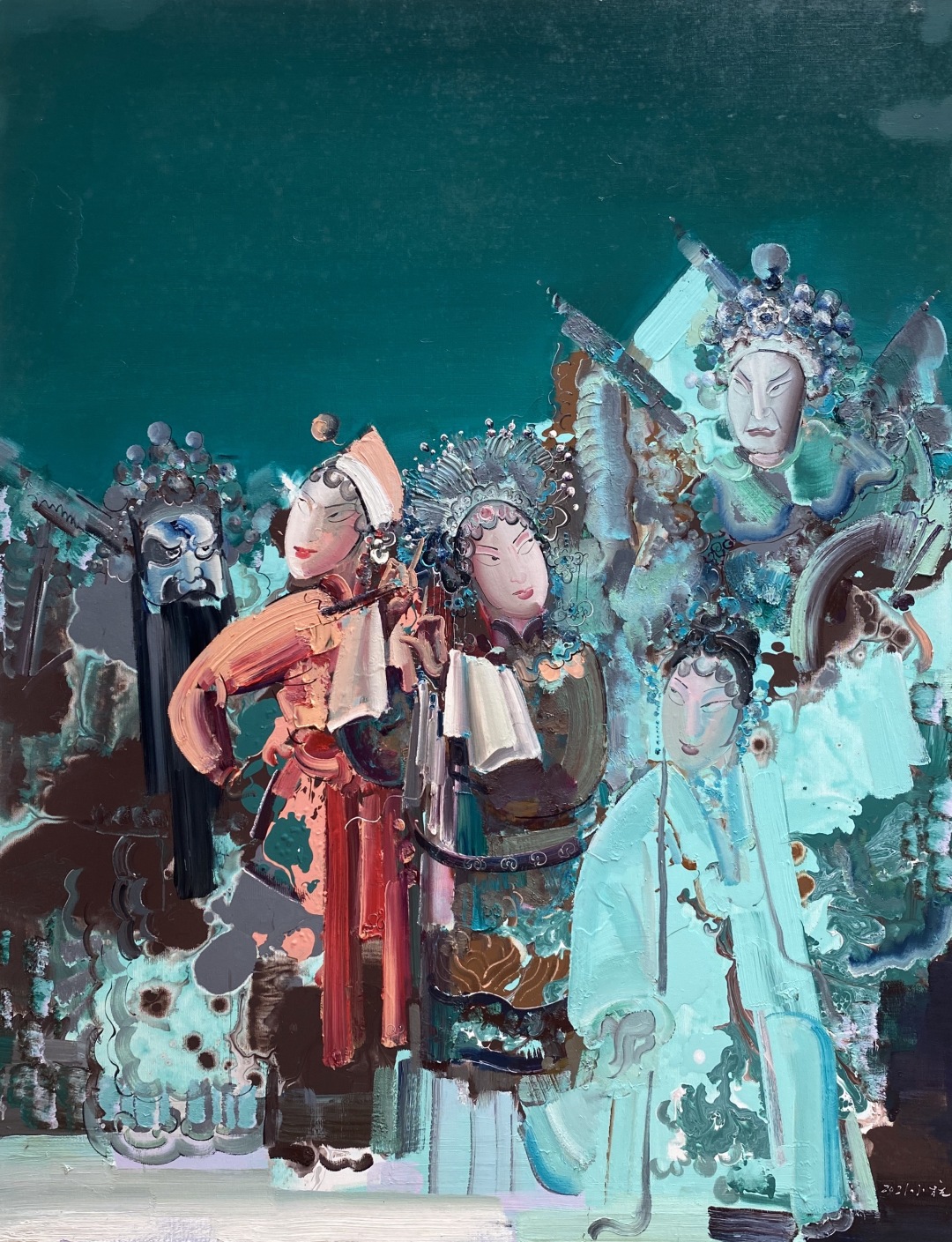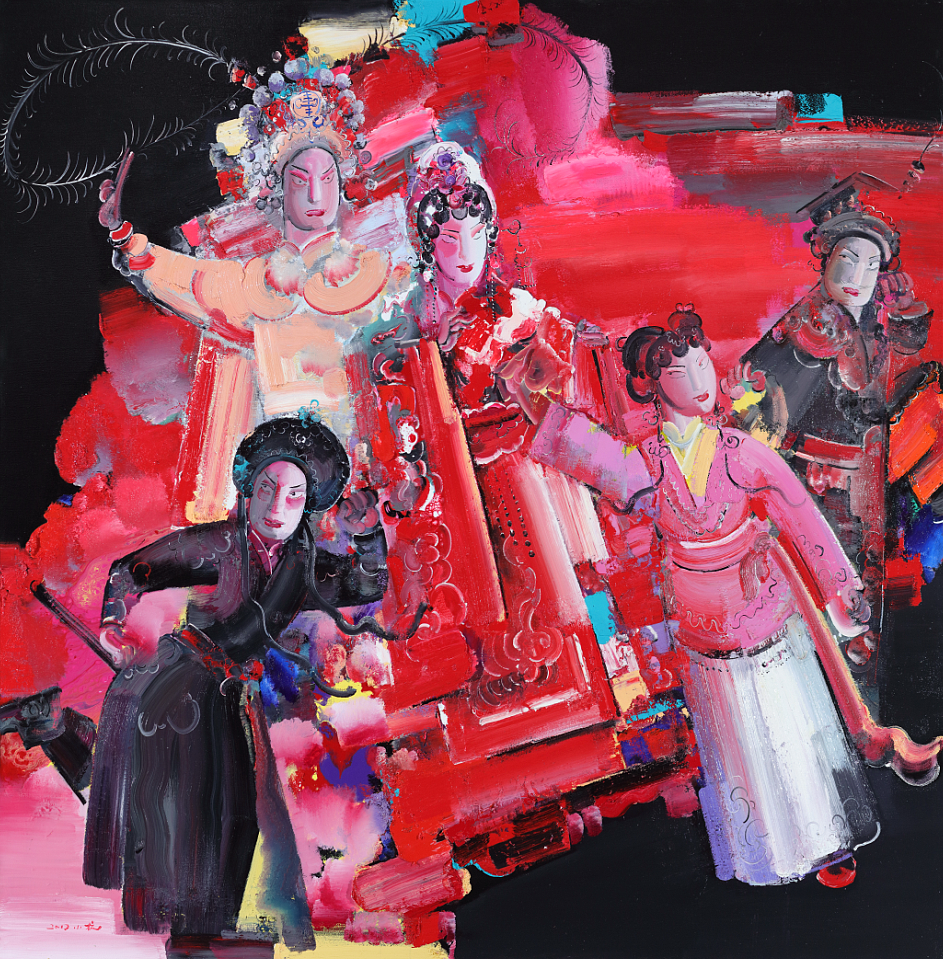 画戏曲题材的人不少,如何吸取传统文化的精华,在当代审美上另辟蹊径?彭小杭坚持用西方油画层叠的色彩与形体展示中国戏曲的神韵。不过,他的作品不是纯粹的油画技法,他是将水墨的感觉和戏曲的情调带入油画中,结合国画的泼墨和勾线技法,又借鉴敦煌壁画斑驳的厚重效果,使画面具有浓郁的中国风。他在大学期间学习过系统的陶瓷专业知识,对颜色釉窑变效果很敏感,于是采用窑变的神奇艺术形式,捕捉那难以预料却能打动人心的点睛之笔。