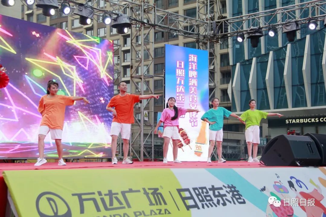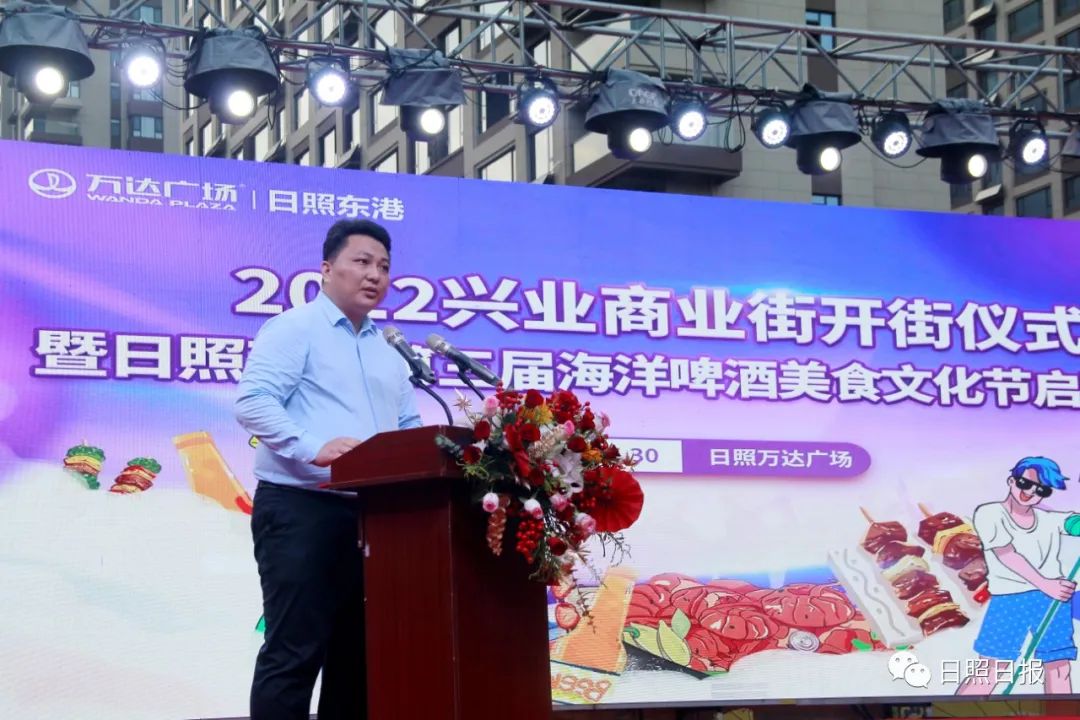 在一段活力舞蹈登台热场后,日照万达广场总经理王江伟致辞。他表示,第三届海洋啤酒美食文化节是日照万达广场积极应对疫情影响,促进夜经济发展,惠民便民利民的一项重大举措,得到了政府各级领导的大力支持。在为期一个月的时间里,现场将有特色美食、清爽啤酒,以及后备箱市集、夏夜嘉年华、乐队演出、网红直播等活动,努力让所有到来的消费者吃得热热闹闹、玩得开开心心、购得欢欢喜喜。
