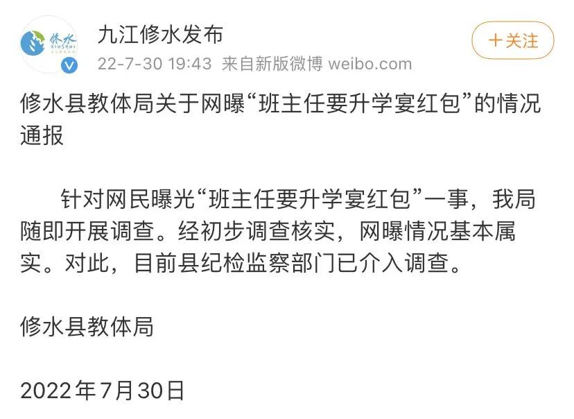 7月30日,江西省九江市修水县融媒体中心官方微博发布《关于网曝“班主任要升学宴红包”的情况通报》: