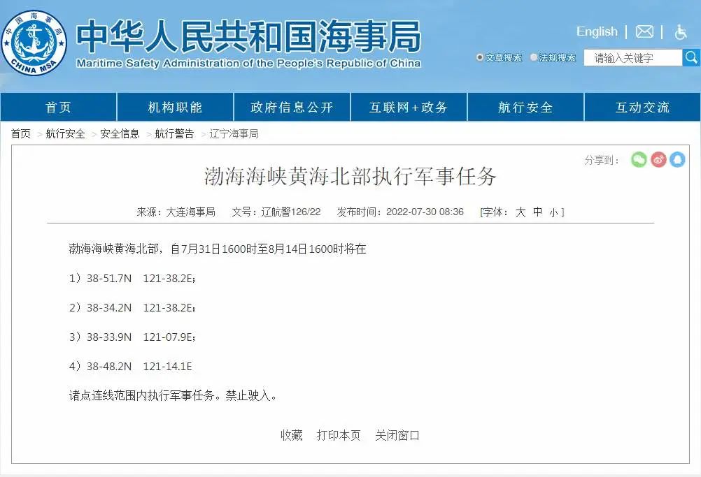 据中国海事局网站消息,大连海事局发布航行警告: