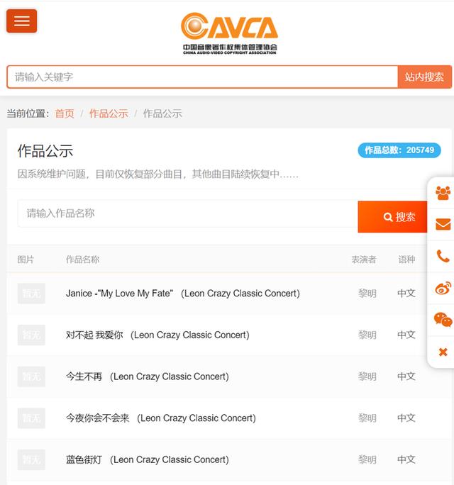 音集协官网“作品公示”界面显示共有作品205749首,同时标有“因系统维护问题,目前仅恢复部分曲目,其他曲目陆续恢复中”。