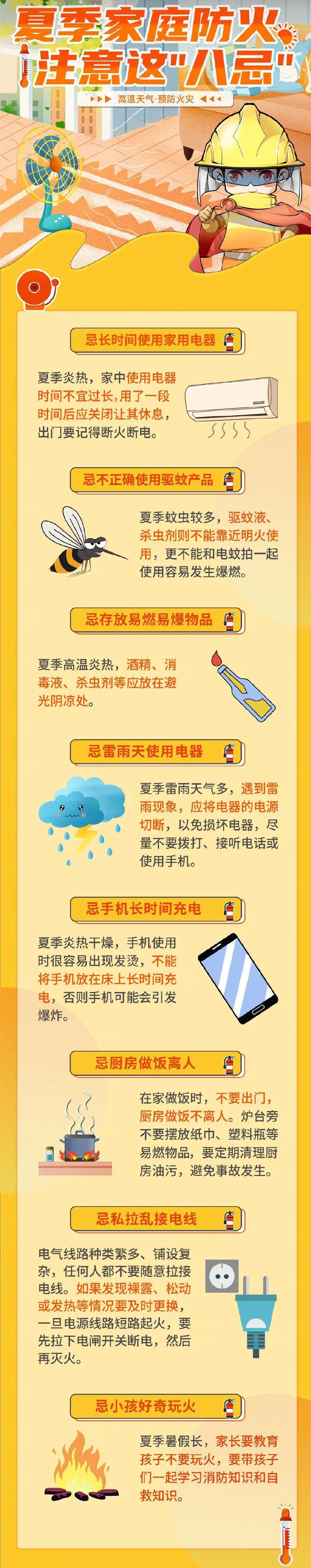 夏季高温,稍不注意的小细节就会引起大火灾,要时刻留意身边火灾隐患,养成良好的用火用电习惯,这份夏季防火指南请收下