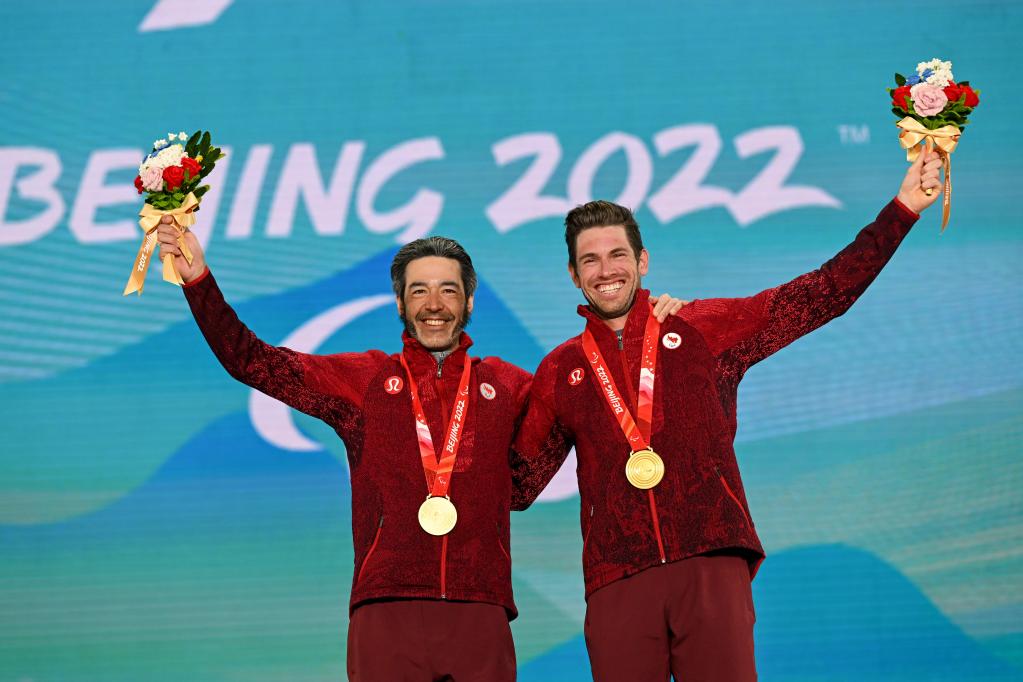 加拿大选手麦基弗(左)和引导员出席颁奖仪式