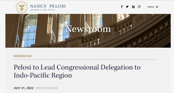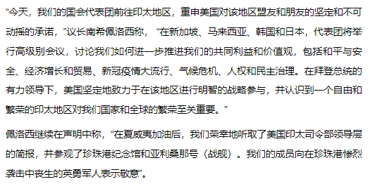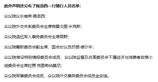 环球网消息,刚刚,美国众议院议长办公室官网公布佩洛西亚洲之行行程,称佩洛西率领一个国会代表团访问印度-太平洋地区,包括访问新加坡、马来西亚、韩国和日本,声明全文未提及台湾地区。