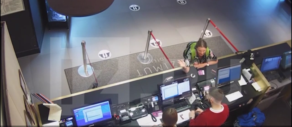 艾琳森与酒店工作人员沟通入住房间事宜,图源:俄《消息报》视频截图