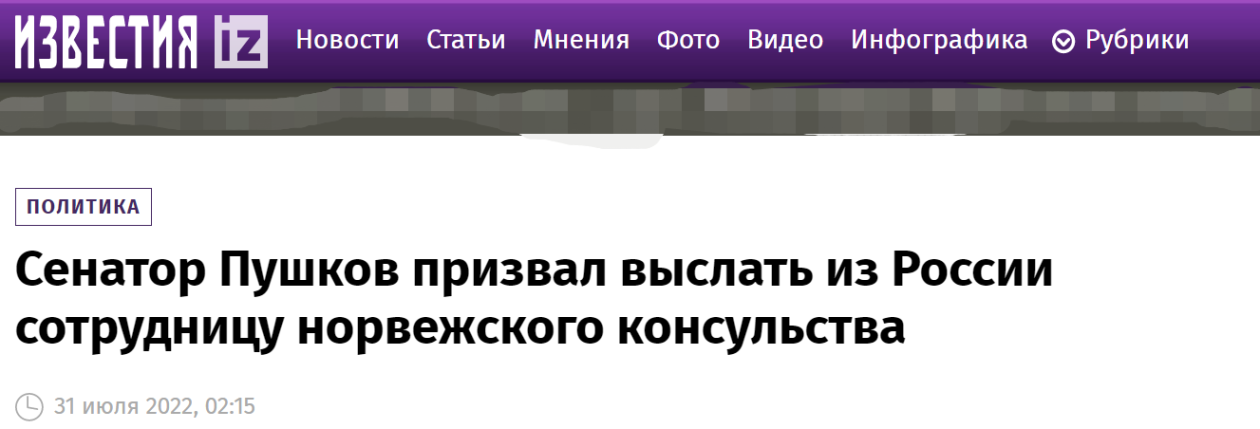 俄《消息报》:(俄)议员普什科夫呼吁将挪威(驻俄)领事馆工作人员驱逐出俄罗斯