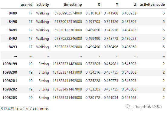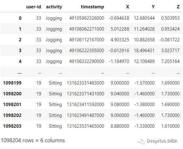 数据集加载和可视化WISDM是由个人腰间携带的移动设备上的加速计记录下来。该数据收集是由个人监督的可以确保数据的质量。我们将使用的文件是WISDM_AR_V1.1_RAW.TXT。使用PANDAS,可以将数据集加载到DataAframe中,如下面代码:
