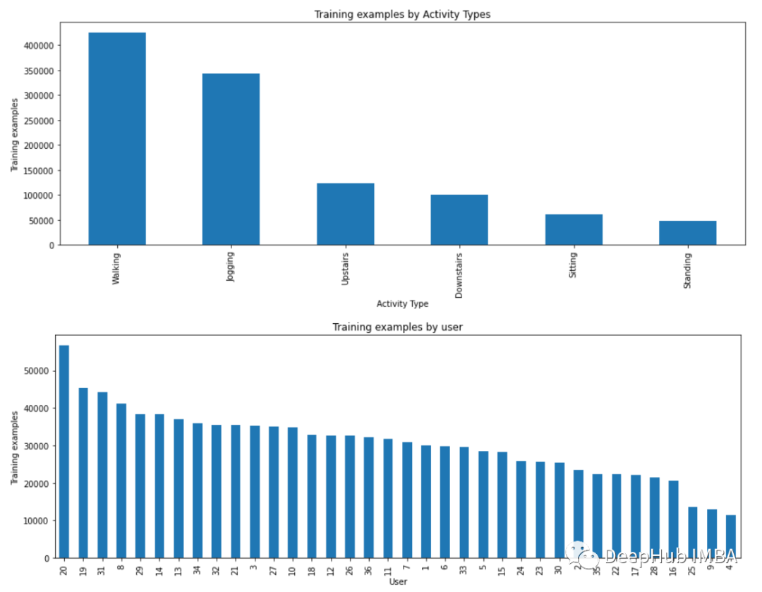 plt.figure(figsize=(15, 5))plt.xlabel('Activity Type')plt.ylabel('Training examples')df['activity'].value_counts().plot(kind='bar', title='Training examples by Activity Types')plt.show()plt.figure(figsize=(15, 5))plt.xlabel('User')plt.ylabel('Training examples')df['user-id'].value_counts().plot(kind='bar', title='Training examples by user')plt.show()