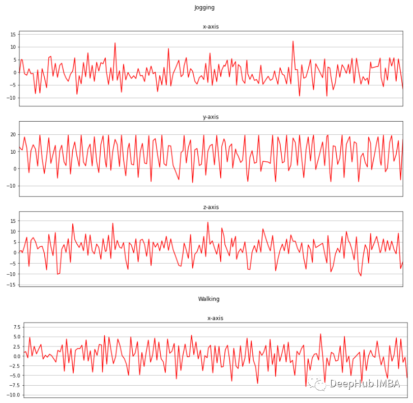 def axis_plot(ax, x, y, title): ax.plot(x, y, 'r') ax.set_title(title) ax.xaxis.set_visible(False) ax.set_ylim([min(y) - np.std(y), max(y) + np.std(y)]) ax.set_xlim([min(x), max(x)]) ax.grid(True)for activity in df['activity'].unique(): limit = df[df['activity'] == activity][:180] fig, (ax0, ax1, ax2) = plt.subplots(nrows=3, sharex=True, figsize=(15, 10)) axis_plot(ax0, limit['timestamp'], limit['X'], 'x-axis') axis_plot(ax1, limit['timestamp'], limit['Y'], 'y-axis') axis_plot(ax2, limit['timestamp'], limit['Z'], 'z-axis') plt.subplots_adjust(hspace=0.2) fig.suptitle(activity) plt.subplots_adjust(top=0.9) plt.show()
