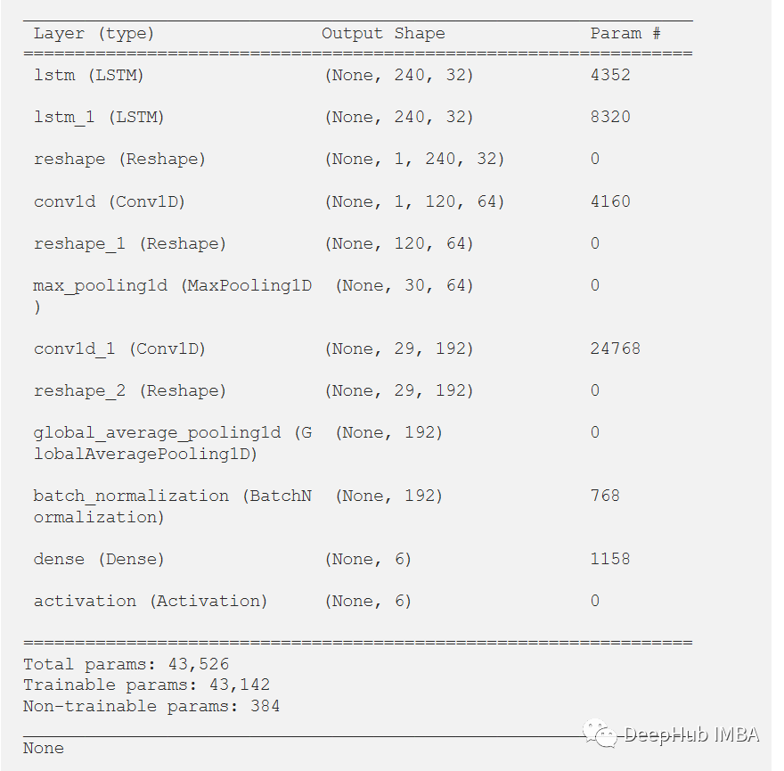 model = Sequential()model.add(LSTM(32, return_sequences=True, input_shape=(input_shape,1), activation='relu'))model.add(LSTM(32,return_sequences=True, activation='relu'))model.add(Reshape((1, 240, 32)))model.add(Conv1D(filters=64,kernel_size=2, activation='relu', strides=2))model.add(Reshape((120, 64)))model.add(MaxPool1D(pool_size=4, padding='same'))model.add(Conv1D(filters=192, kernel_size=2, activation='relu', strides=1))model.add(Reshape((29, 192)))model.add(GlobalAveragePooling1D())model.add(BatchNormalization(epsilon=1e-06))model.add(Dense(6))model.add(Activation('softmax'))print(model.summary())