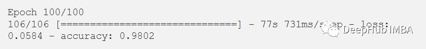 model.compile(loss='categorical_crossentropy', optimizer='adam', metrics=['accuracy'])history = model.fit(x_train, y_train_hot, batch_size= 192, epochs=100 )