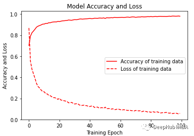 plt.figure(figsize=(6, 4))plt.plot(history.history['accuracy'], 'r', label='Accuracy of training data')plt.plot(history.history['loss'], 'r--', label='Loss of training data')plt.title('Model Accuracy and Loss')plt.ylabel('Accuracy and Loss')plt.xlabel('Training Epoch')plt.ylim(0)plt.legend()plt.show()y_pred_train = model.predict(x_train)max_y_pred_train = np.argmax(y_pred_train, axis=1)print(classification_report(y_train, max_y_pred_train))