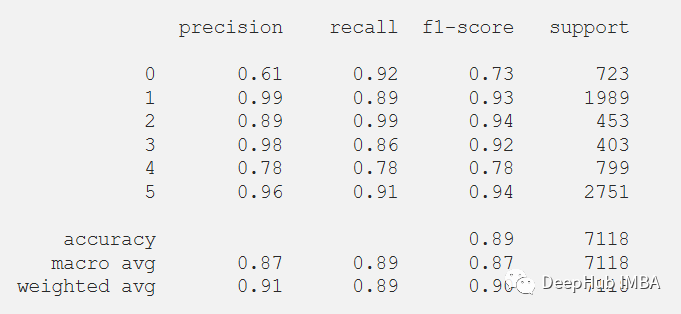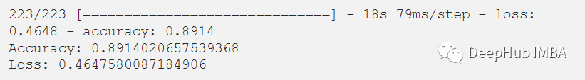在评估我们的测试数据集后,得到了89.14%的准确率和0.4647的损失。F1测试得分为0.89。