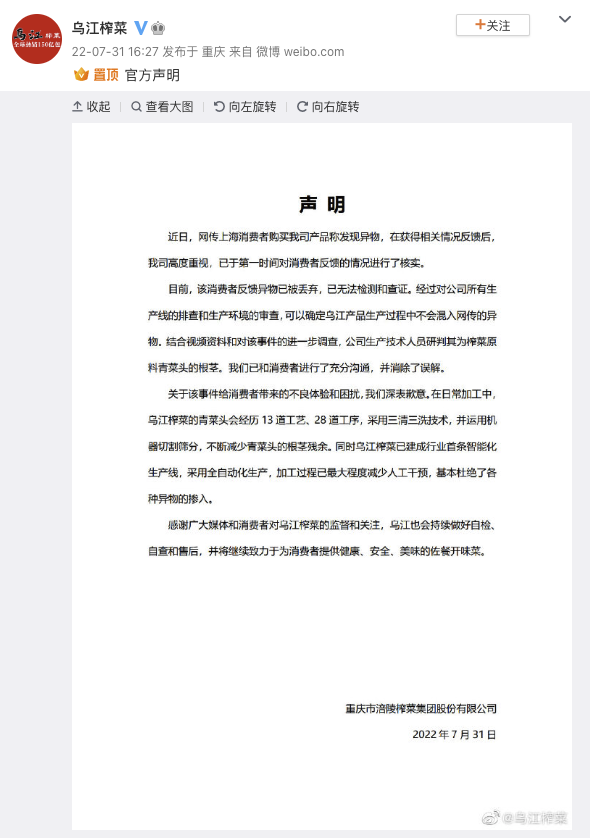 7月31日下午,就消费者爆料称乌江榨菜里吃出脚趾甲一事,重庆市涪陵榨菜集团股份有限公司发布致歉声明称,已于第一时间对消费者反馈的情况进行了核实。目前,该消费者反馈异物已被丢弃,已无法检测和查证,“结合视频资料和对该事件的进一步调查,公司生产技术人员研判其为榨菜原料青菜头的根茎”。涪陵榨菜表示,已和消费者进行了充分沟通,并消除了误解。