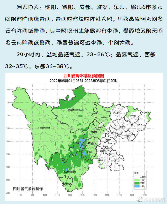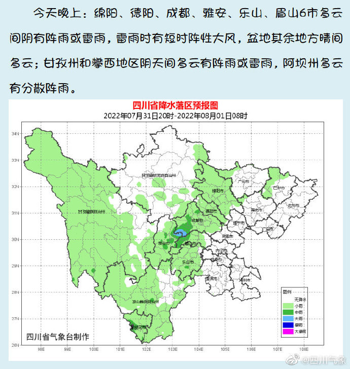 据@四川气象7月31日16时40分左右消息,未来24小时:绵阳、德阳、成都、雅安、乐山、眉山6市多云间阴有阵雨或雷雨,雷雨时有短时阵性大风,局部中到大雨,个别暴雨,盆地其余地方晴间多云;川西高原阴天间多云有阵雨或雷雨,其中甘孜州南部和阿坝州北部局部有中雨;攀西地区阴天间多云有阵雨或雷雨,雨量普遍可达中雨,个别大雨。