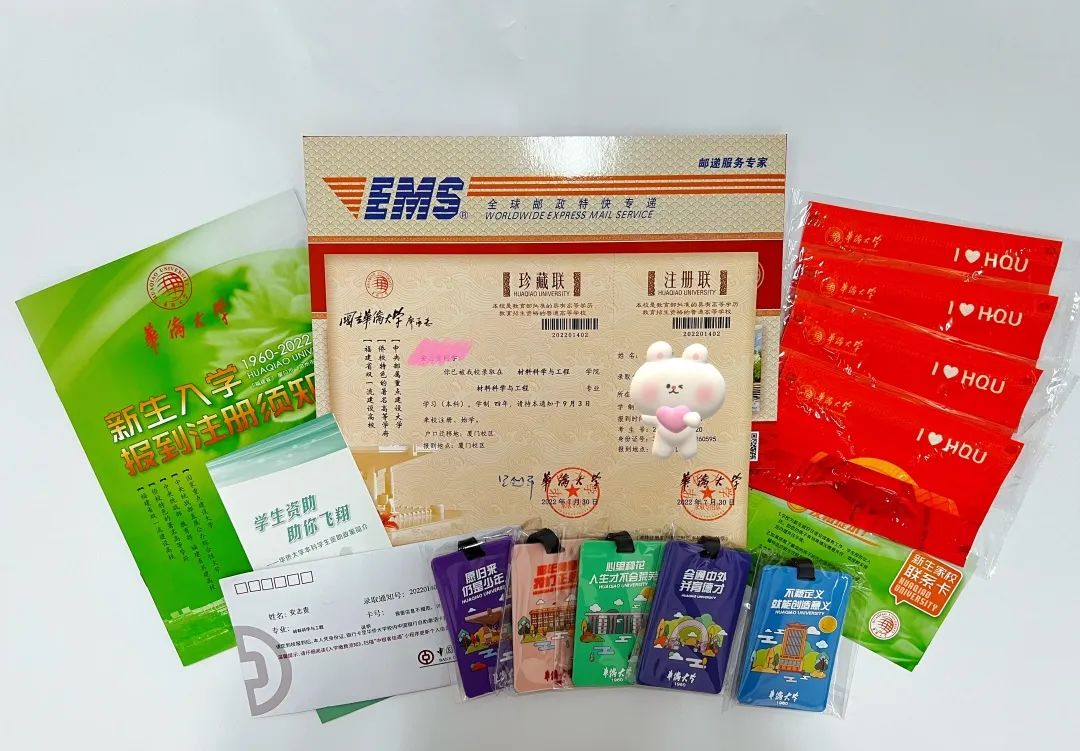 华侨大学录取通知书、新生入学报到注册须知、华侨大学本科学生资助政策简介、中国银行借记卡、新生家校联系卡、华侨大学定制口罩、华侨大学定制登机牌