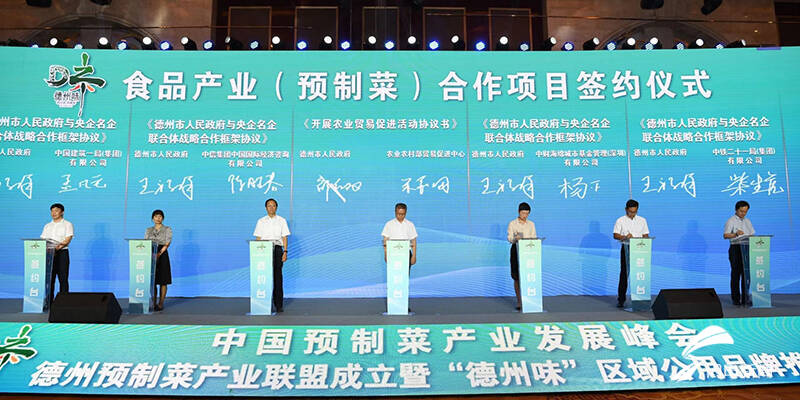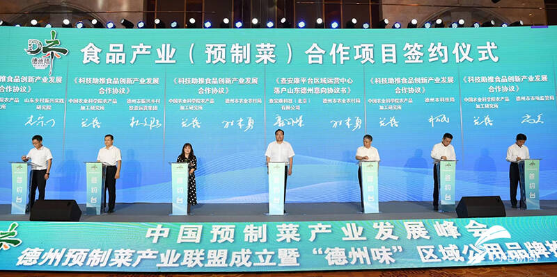 嘉宾讲话和致辞结束后,活动进入揭牌和签约环节。宋聚国、田卫东为德州预制菜产业联盟揭牌;宋民、卜祥联为国家农产品加工产业科技创新联盟预制菜专业委员会德州分会揭牌;王凤忠与德州市委常委、副市长王福祥为国家农产品加工产业科技创新联盟德州中心揭牌。德州市预制菜产业联盟理事长谭英潮宣读联盟倡议书。