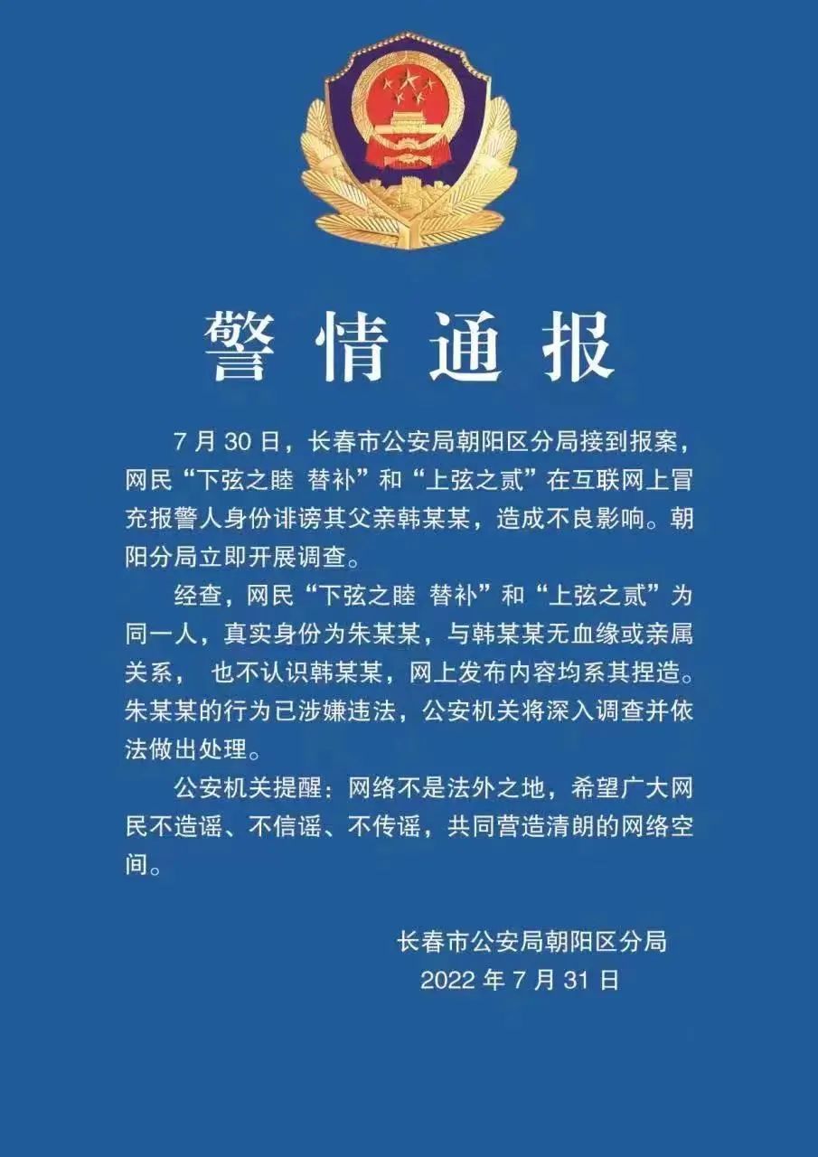 通报称,7月30日,朝阳区分局接到报案,网民“下弦之睦 替补”和“上弦之贰”在互联网上冒充报警人身份诽谤其父亲韩某某,造成不良影响。朝阳分局立即开展调查。