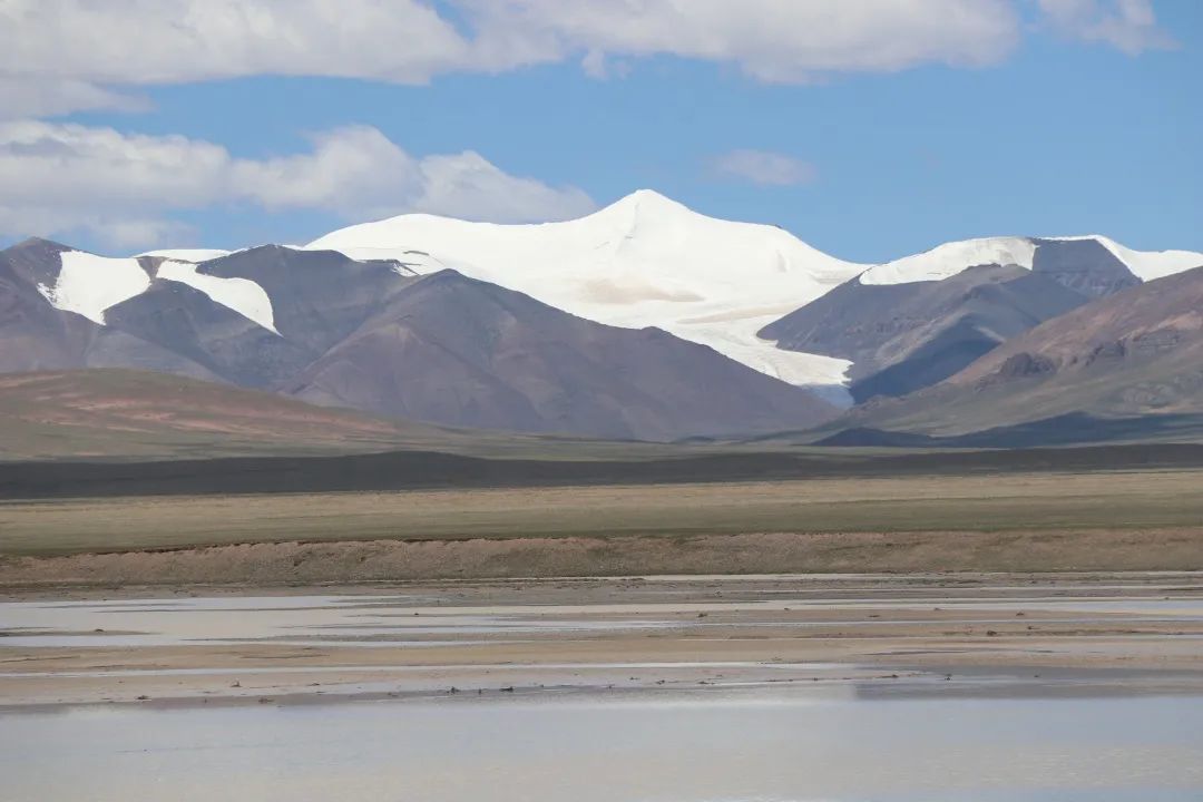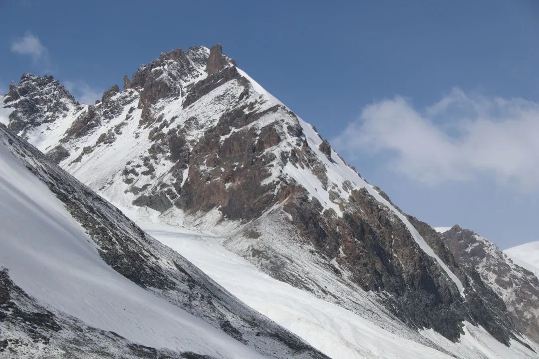 地质组成员跟随申添毅老师,向格拉丹东山区腹地进发。越野车在砾石滩上艰难曲折地前进,多亏了阿旺师傅高超的车技也多年的经验,我们得以挺进格拉丹东雪山群一座侧锋的脚下。最终,我们被一条冰川融水河流挡住了去路。前面的路需要我们用双脚来丈量。