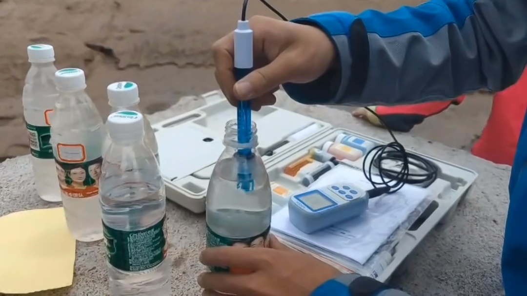 大拐弯处河流阶地发育明显,水样呈碱性,电导率较高,进行生物采样时发现了浮游生物若干,具体待测,前侧波龙曲水样现场指标相近,其他指标待测。