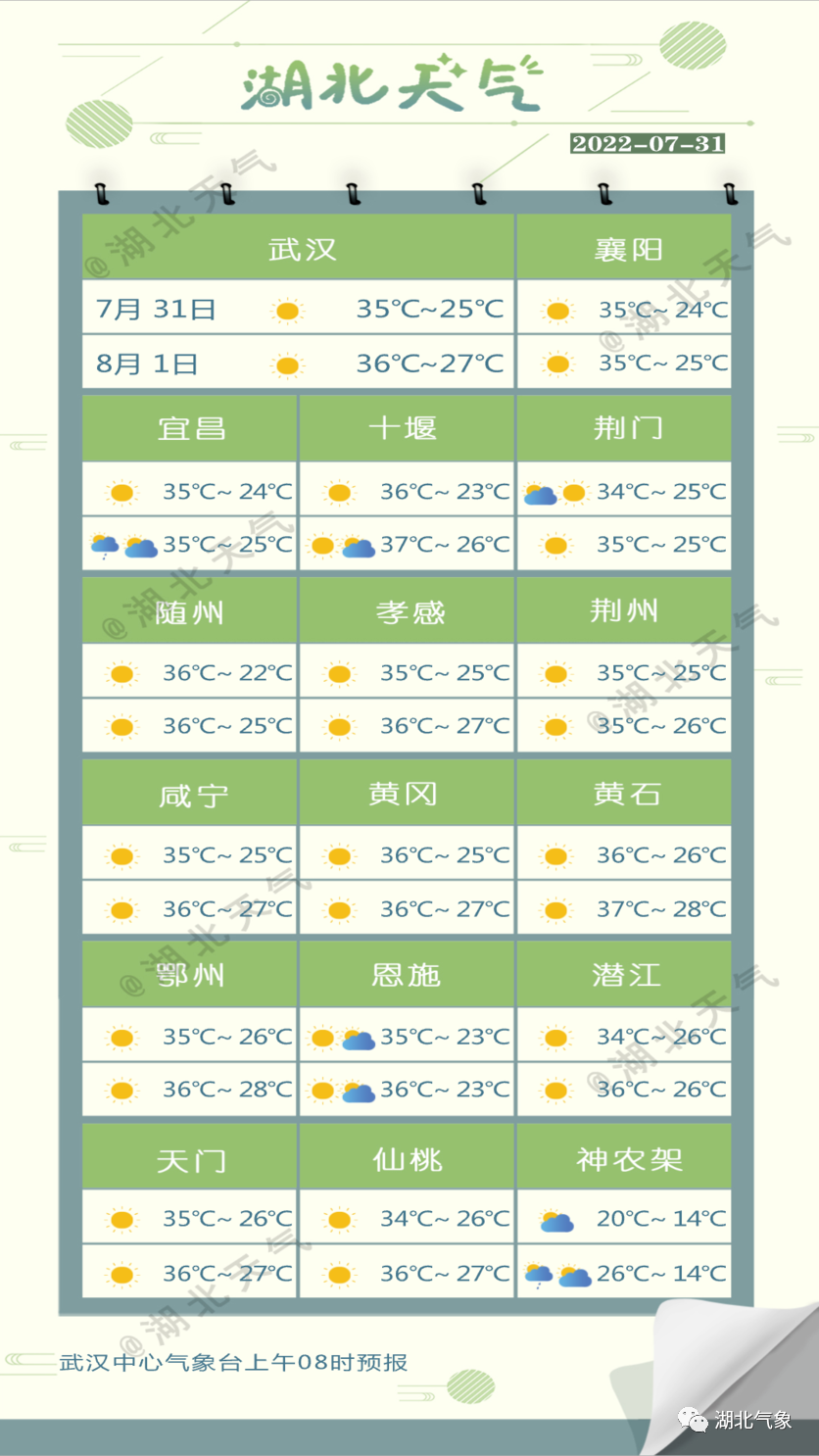 最低气温:恩施地区22~25℃;其他地区26~29℃