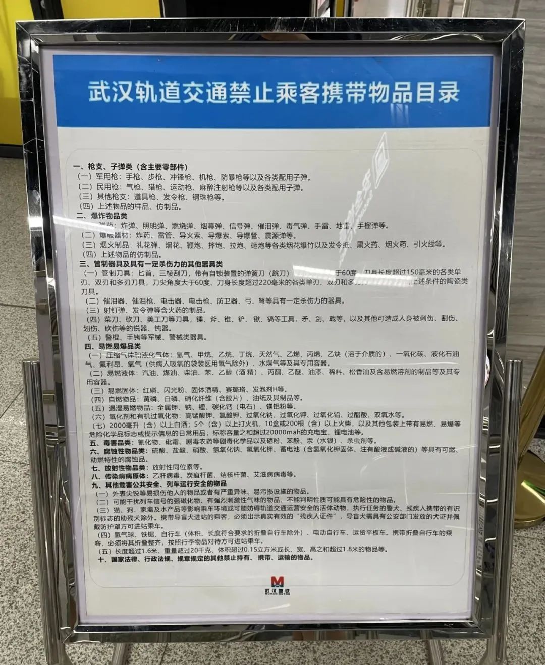 武汉地铁站安检处公示的《武汉轨道交通禁止乘客携带物品目录》